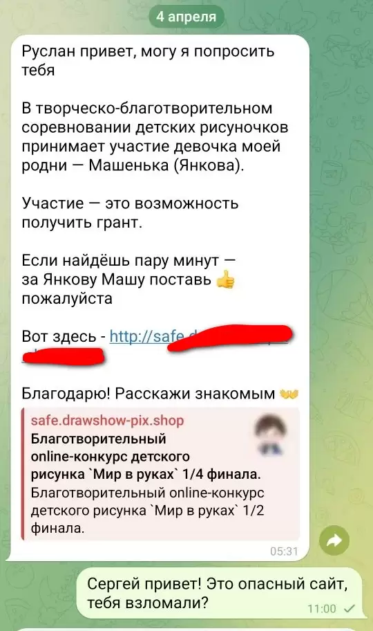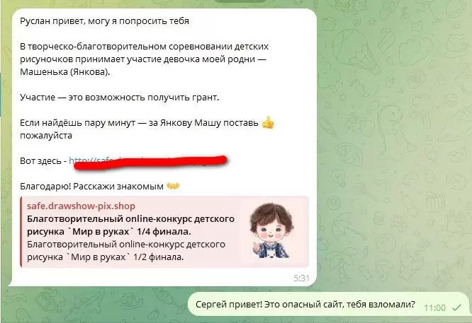 Руслан Юрковский рассказал, что сегодня утром ему пришло сообщение от знакомого, который просил его проголосовать за дочь родственников, участвующую в конкурсе детских рисунков. Для этого нужно пройти по ссылке и поставть лайк.