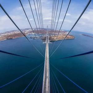 Напомним, строительство Русского моста началось в начале сентября 2008 года и продолжалось 4 года. И по сей день, это мост-рекордсмен по длине пролёта среди вантовых мостовых конструкций (1104 метра). Благодаря окраске вант, это еще и самый большой российский триколор в мире.