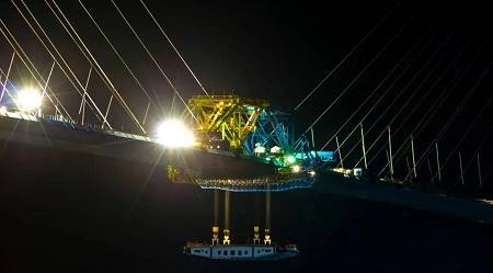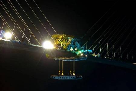 Почему стыковку проводили ночью? Потому что Солнце нагревало только одну из сторон мостового пролёта, и она расширялась на 2,5-3 см, в то время как другая сторона сохраняла заданные масштабы. И чтобы замыкающая панель четко, без перекосов, встала на своё место, строители дожидались полного выравнивания конструкций.