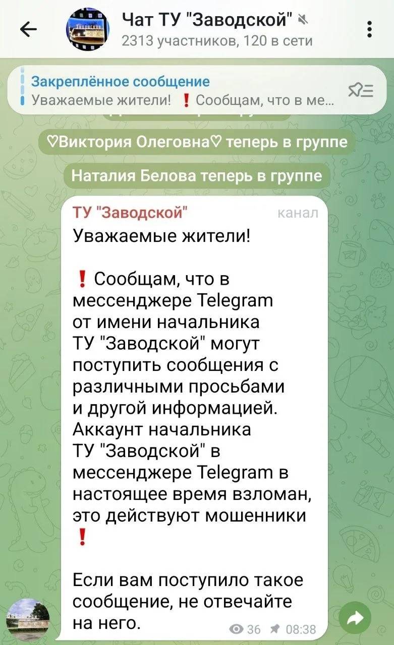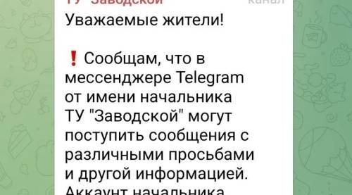 "Аккаунт начальника ТУ "Заводской" в мессенджере Telegram в настоящее время взломан. Это действуют мошенники", - соответствующее объявление сделали в территориальном управлении.