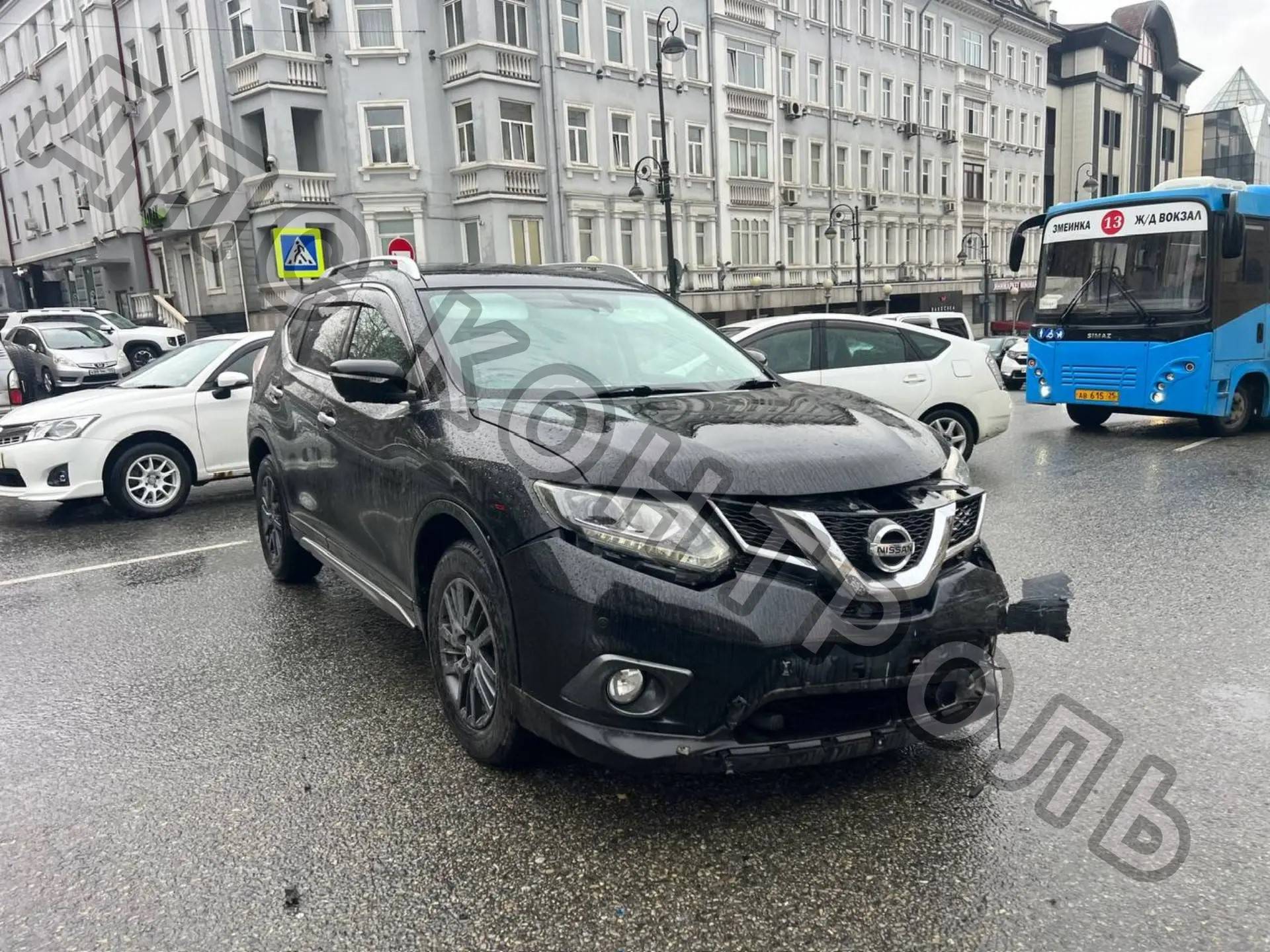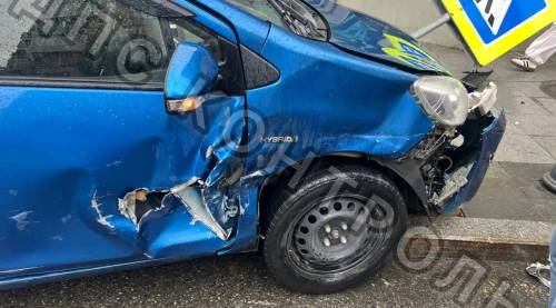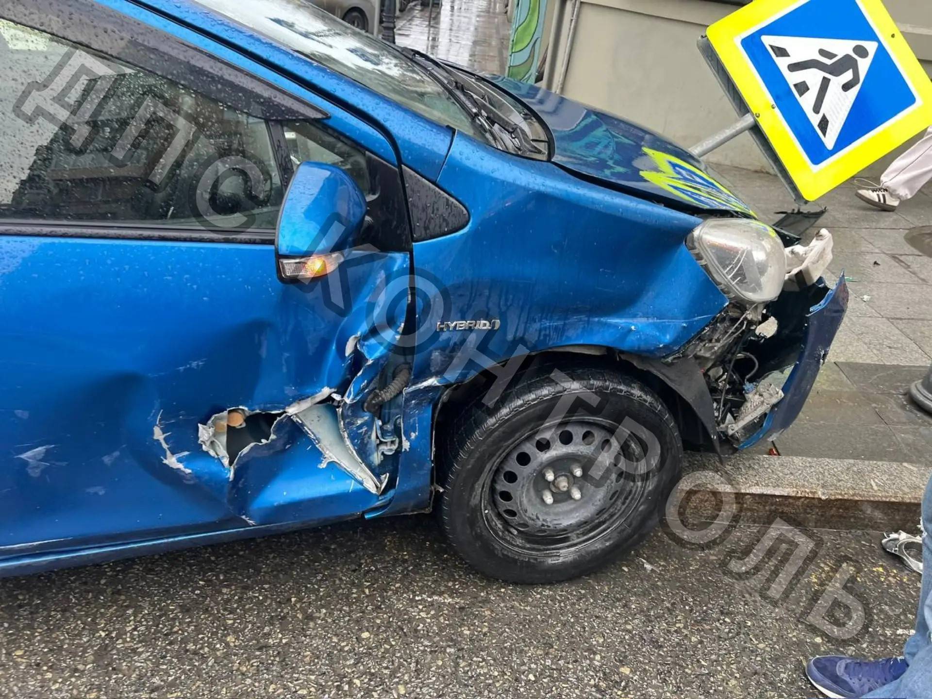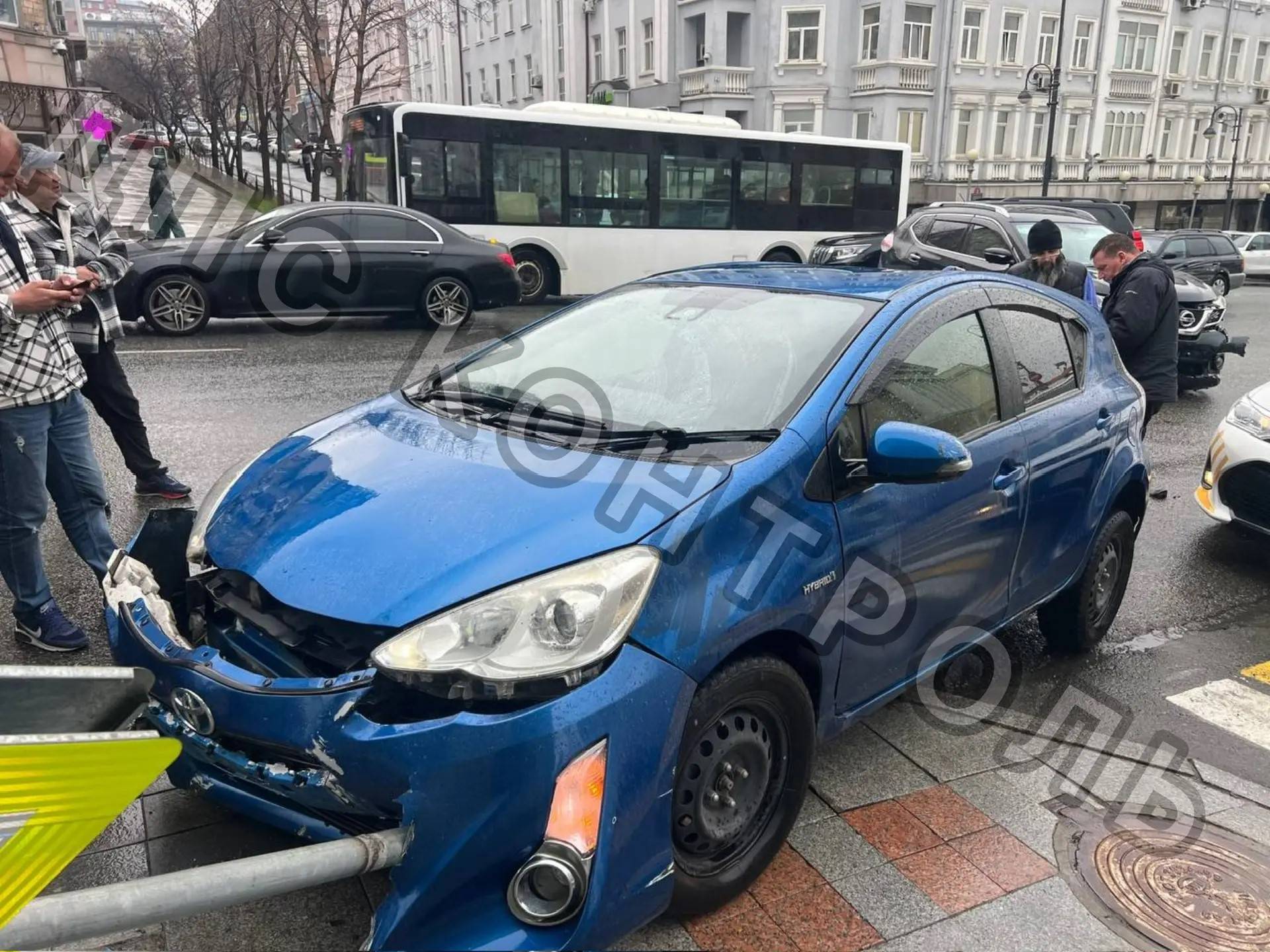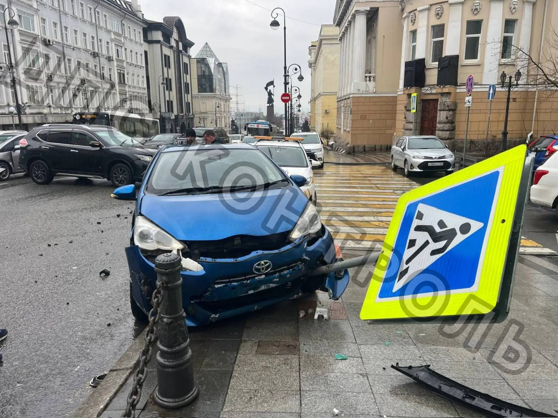 Авария произошла по адресу Океанский проспект 7. Водитель X-Trail, выезжая со стороны Фокино пытался проехать прямо, несмотря на запрещающий знак и влетел в Toyota Aqua. Легковушку от удара выбросило,и на тротуар, где она сбила дорожный знак.