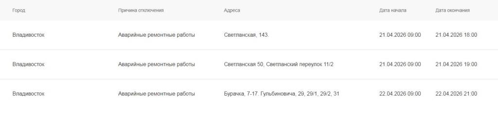 21-22 апреля во Владивостоке в связи с аварийными ремонтными работами запланирована серия локальных отключений холодного водоснабжения.