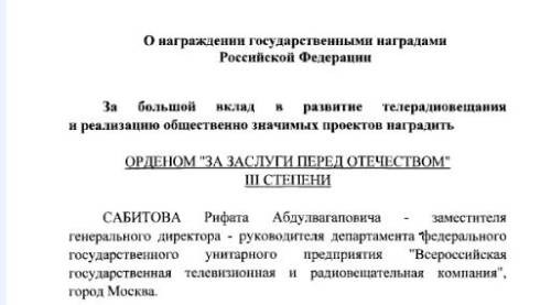 В тексте президентского Указа подчеркивается, что Рифат Сабитов "награжден за большой вклад в развитие телерадиовещания и реализацию общественно значимых проектов".