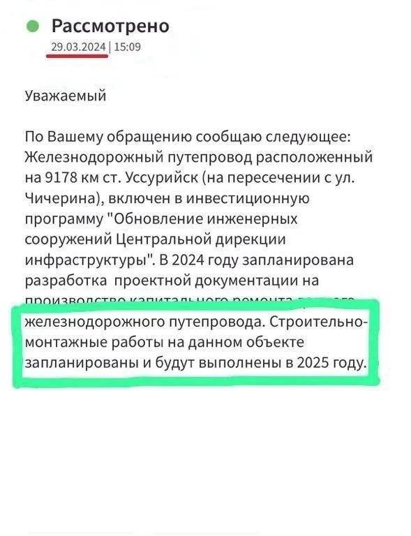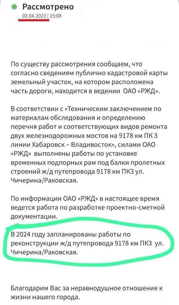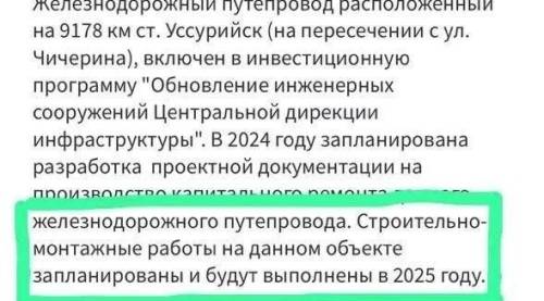 Фактически сложилась ситуация, когда интересы города и требования железнодорожной инфраструктуры расходятся по срокам: Уссурийску нужно как можно быстрее разгрузить узел на Чичерина, в то время как железная дорога может выделять для работ лишь ограниченное время, чтобы не нарушать график движения поездов. На практике это выглядит как хроническая «затянутость» ремонта: для горожан проходят годы ожиданий, а для служб — это цепочка мелких согласований и временных допусков и отписок.
