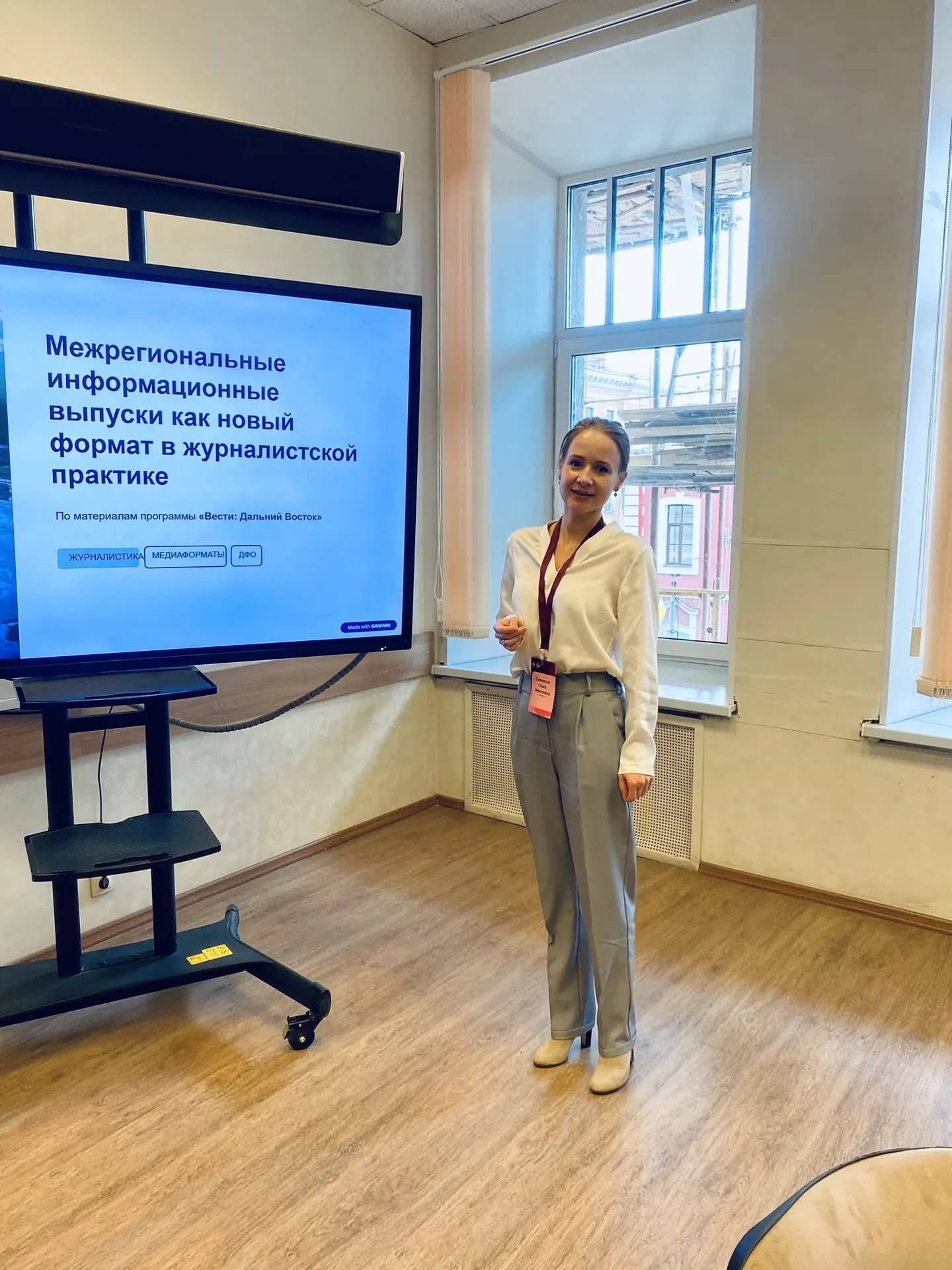Научная конференция теоретиков и практиков журналистского мастерства ежегодно объединяет десятки ученых России, Армении, Белоруссии, Казахстана, Монголии и Китая. Организатор Форума - Институт «Высшая школа журналистики и массовых коммуникаций» Санкт-Петербургского государственного университета. Теперь предметом научного осмысления стала и межрегиональная программа «Вести: Дальний Восток». С докладом на представительном мероприятии выступила редактор и ведущая «Вести: Дальний Восток» - Ольга Порва.