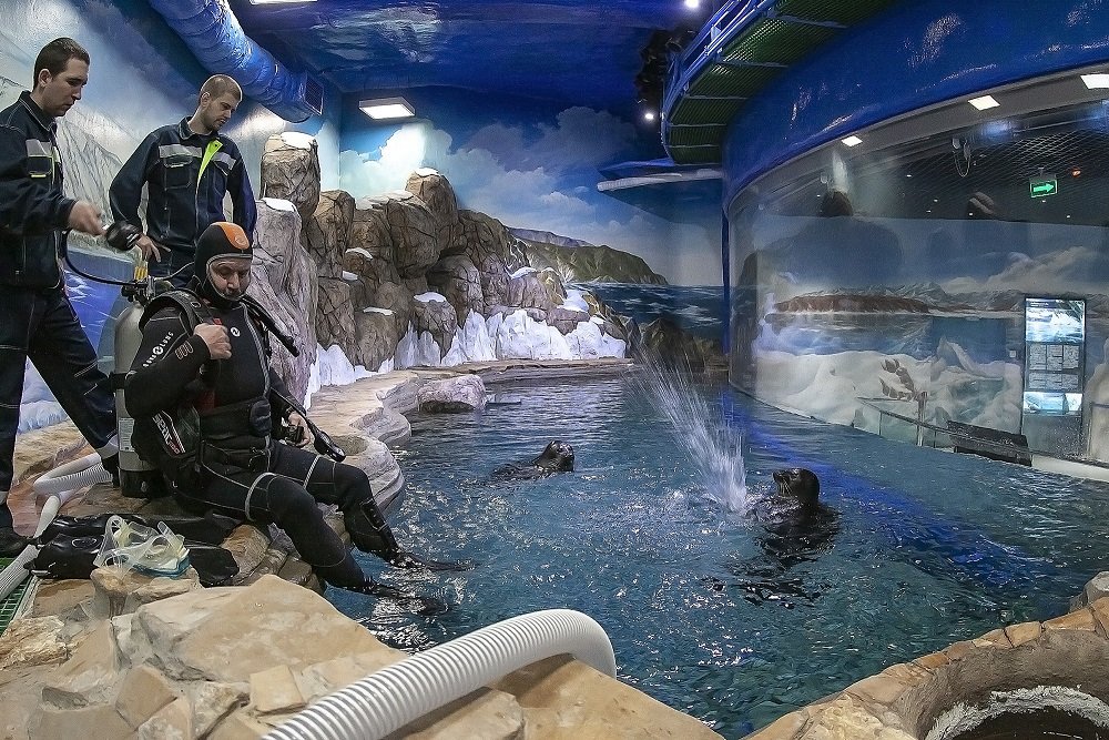 Зона ответственности водолазов в Приморском океанариуме - крупные аквариумы, бассейны и садки. Они чистят дно, стены и стекла от отложений и нарастаний. От этой работы во многом зависит качество воды и в конечном счете - здоровье животных.