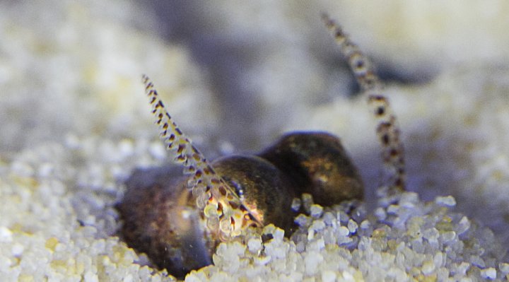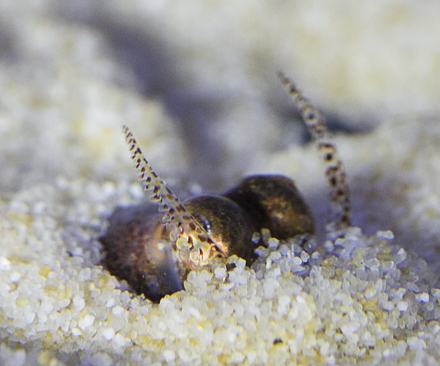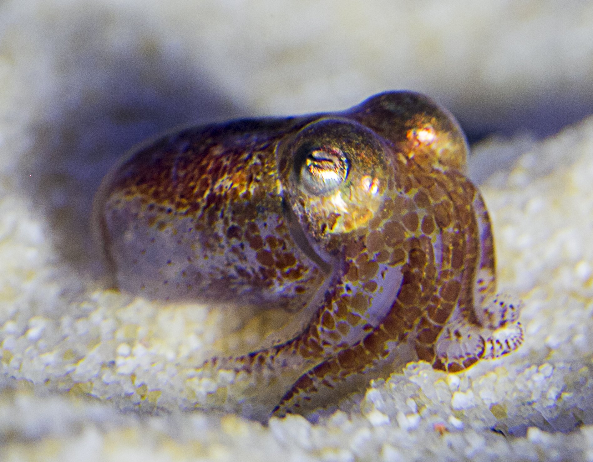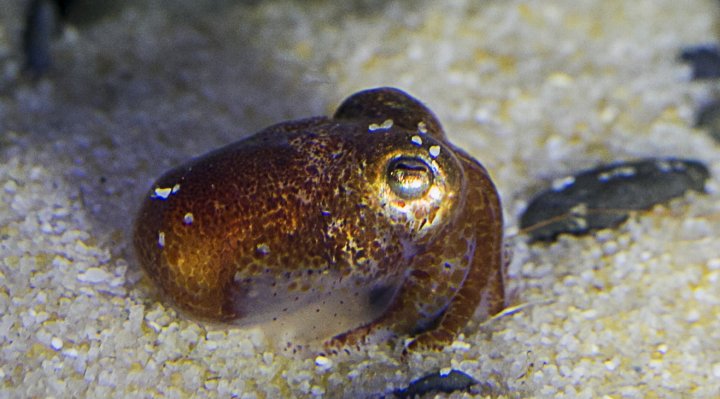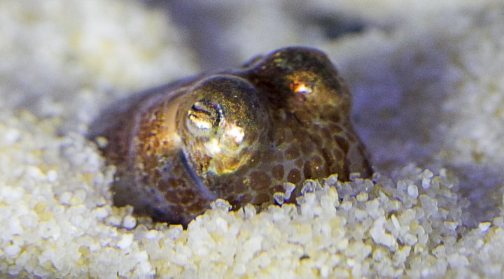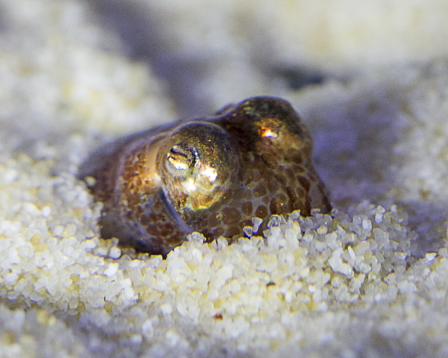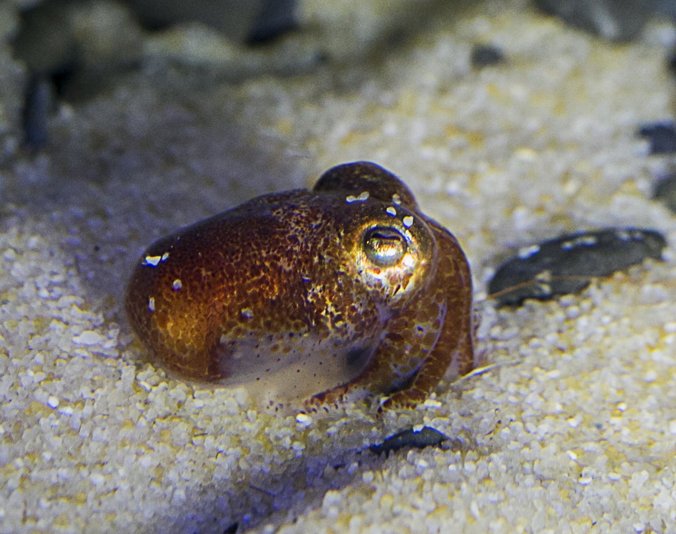 На первый взгляд может показаться, что один из аквариумов Приморского океанариума в разделе «Мастера маскировки» необитаем, однако внимательные посетители обязательно разглядят три пары глаз, которые следят за тем, что происходит вокруг из песчаных горок на дне. В аквариуме поселилось трио сепиолы двурогой (Sepiola birostrata) или «чочин-ику», как эту миниатюрную каракатицу называют в Японии.