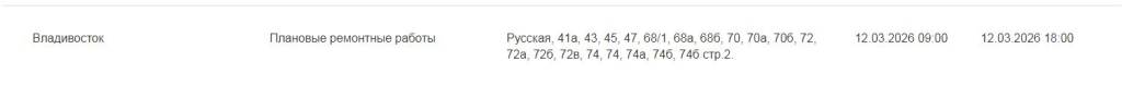 12 марта с 9 до 18 часов в связи с плановыми работами без холодного водоснабжения останутся 19 многоквартирных домов на улице Русская во Владивостоке, сообщает сайт Примвода.