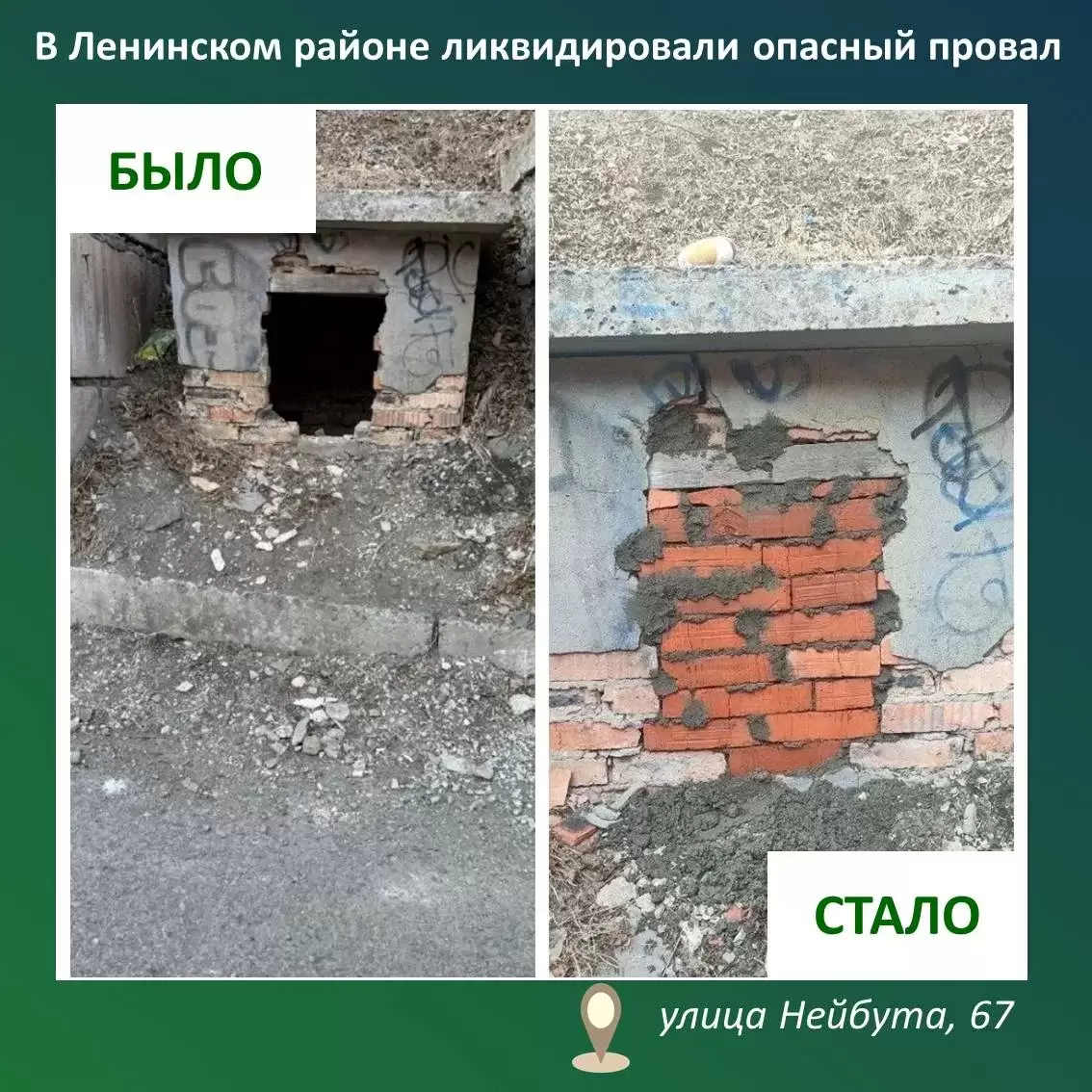 Учитывая, что данная ситуация представляла угрозу безопасности, МЦУ оперативно проинформировал административно-территориальное управление Ленинского района, и благодаря слаженной работе сил муниципального предприятия «Содержание городских территорий» оперативно устранён провал в указанной локации.